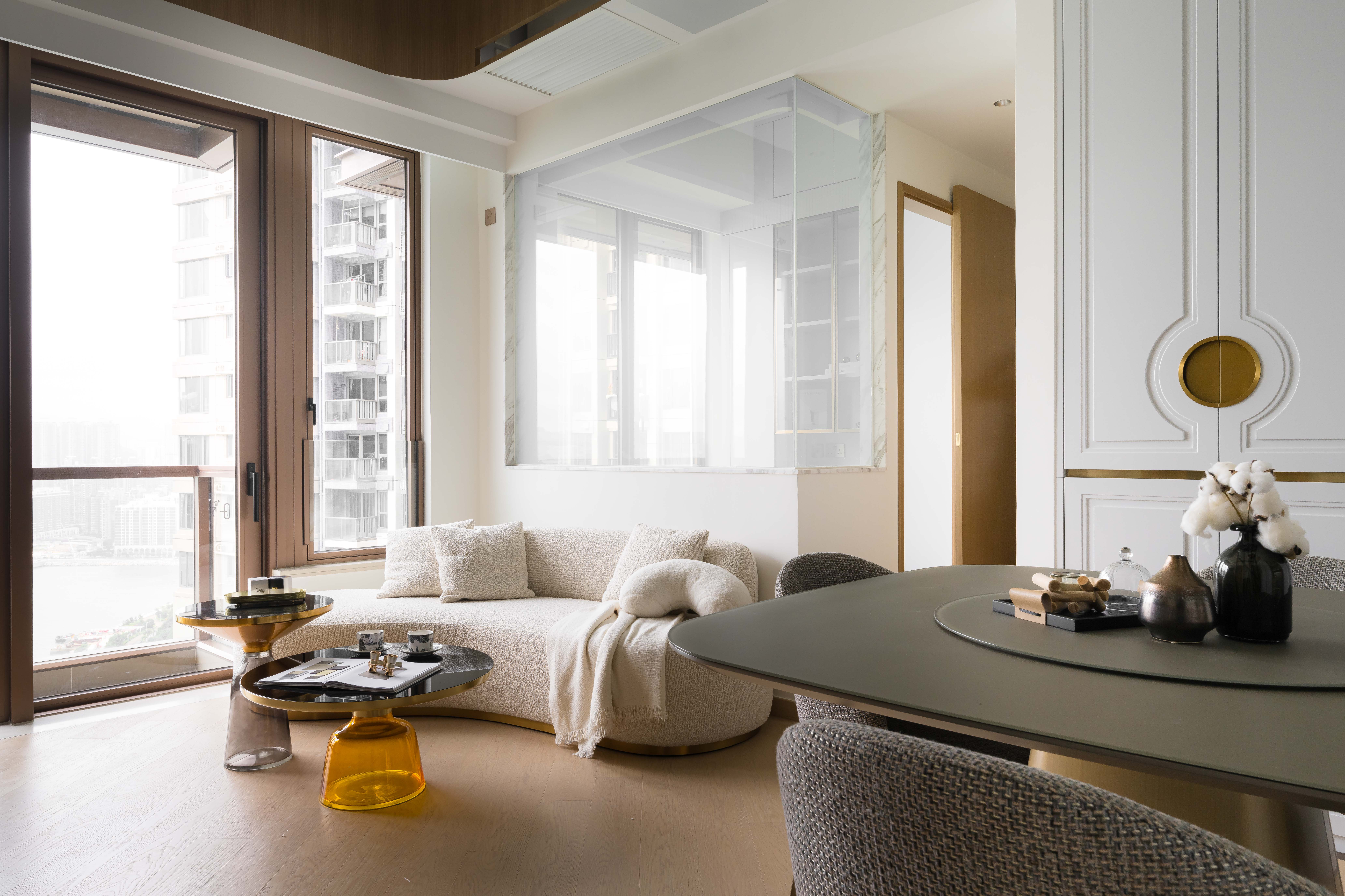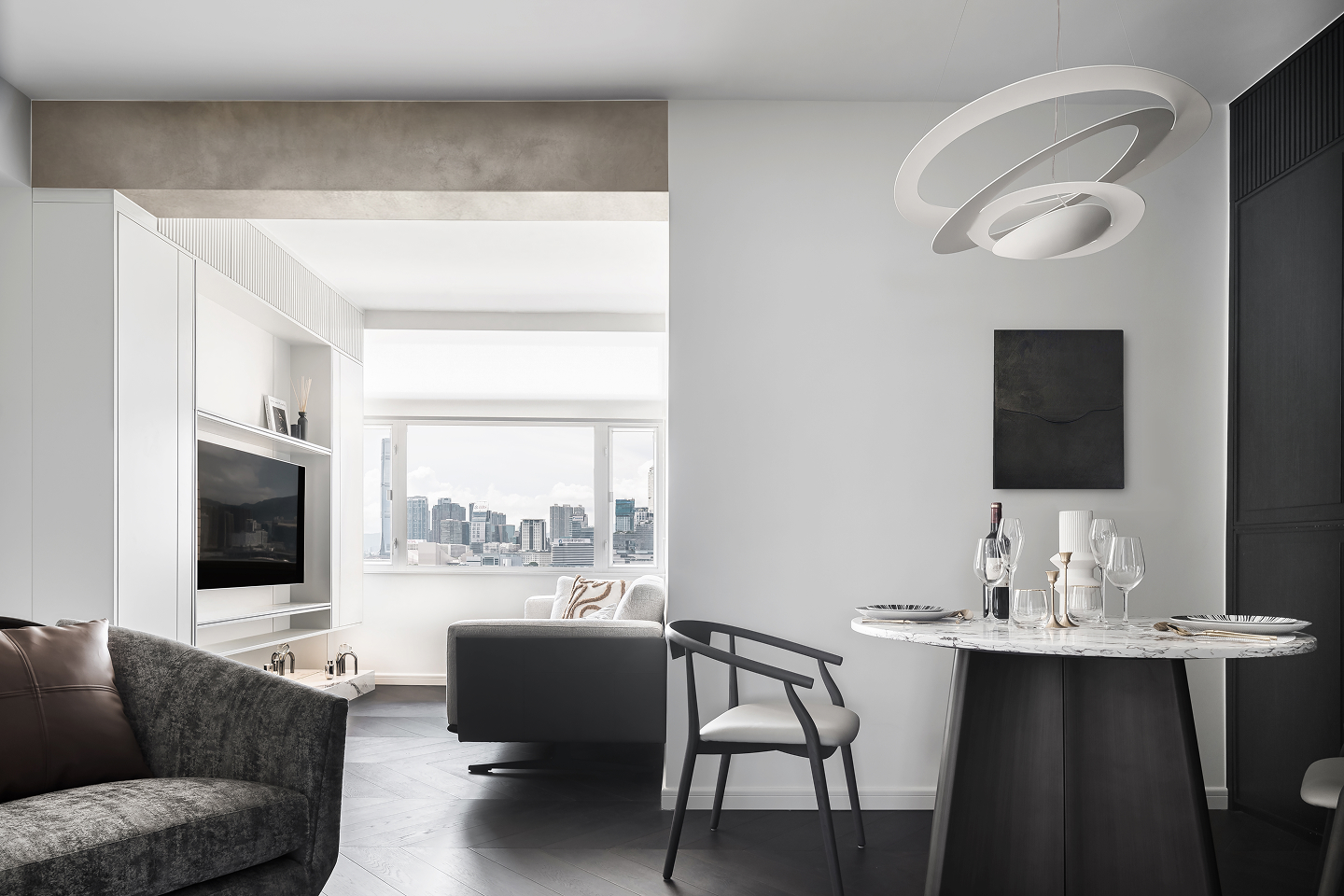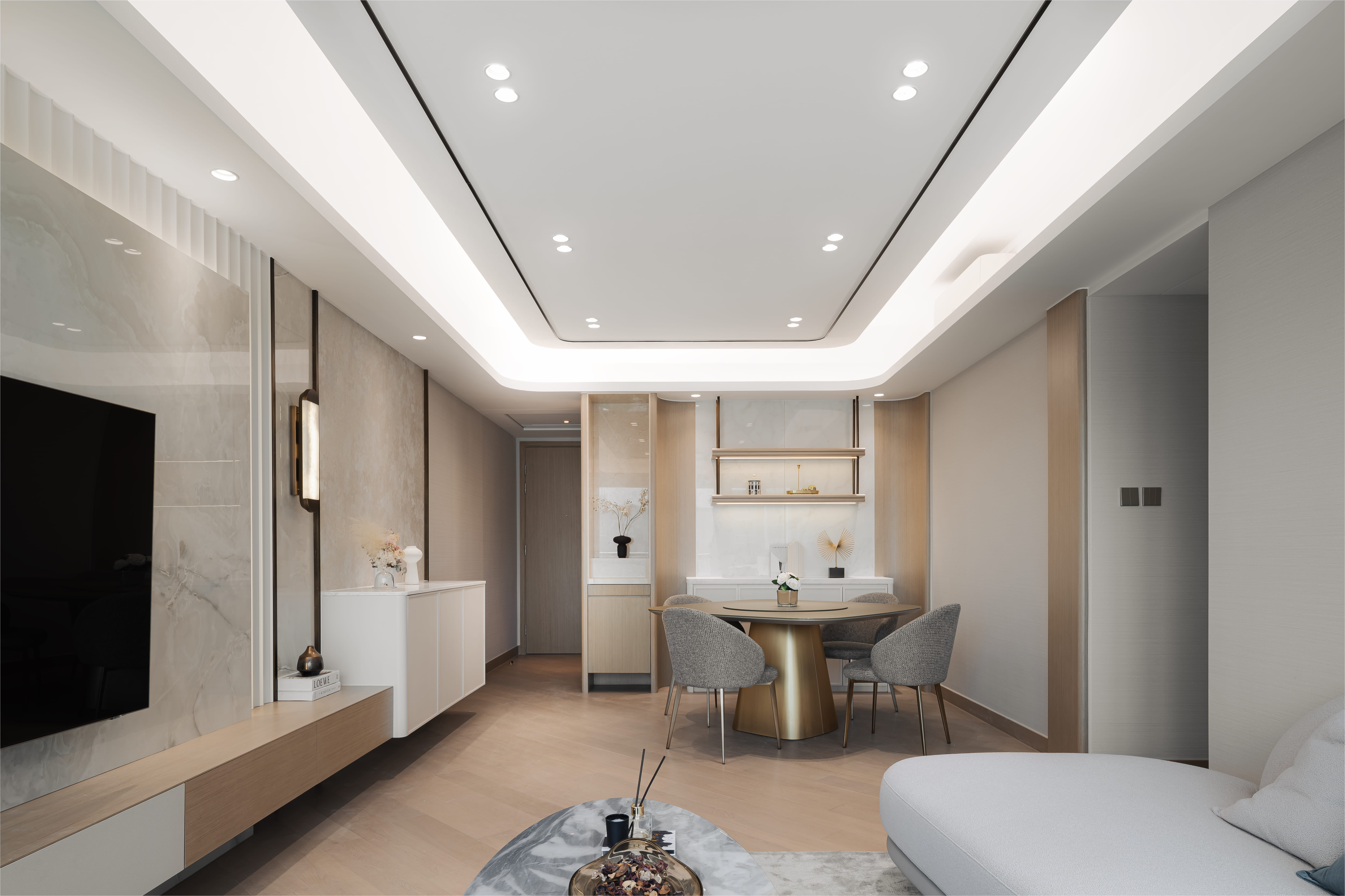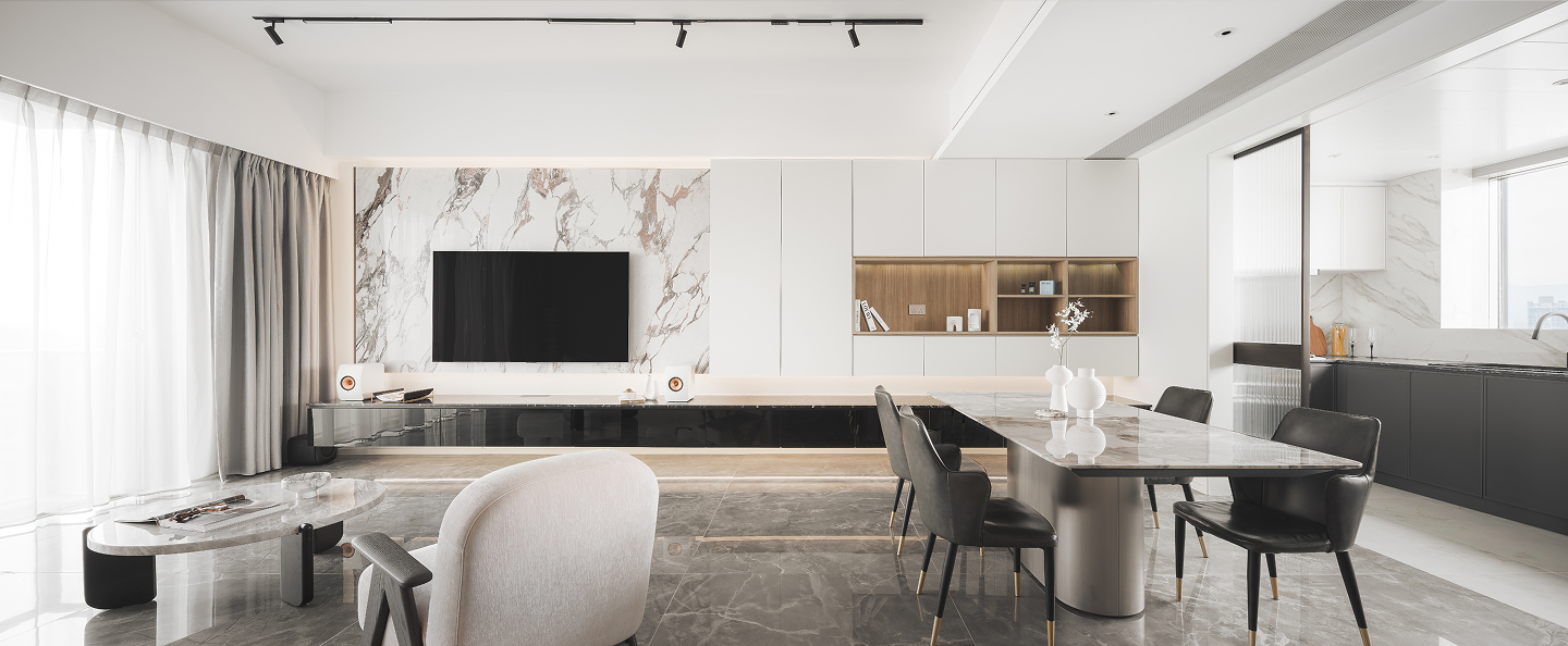 Minimal choice on palette yet rich in use of elegant forms. From entrance to TV wall, guests will be presented with different morphological curves.